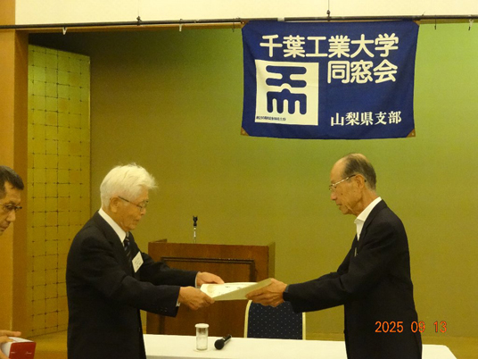 また、今年度は役員改選の年であり、今年度は支部長の交代がありました。小澤元支部長は平成29年度~令和7年度までの8年間支部長を勤めて頂き、会社経営を長年され山梨県内の経済界に広く信仰がありその人脈から、千葉工業大学と山梨大学との包括外部協定や甲斐ゼミナールでのサテライト会場、シャトレーゼと千葉工業大学を結びつけていただきました。これもひとえに小澤元支部長の尽力によるものでありました。その功績を記念して支部から感謝状と記念品が贈呈されました。新支部長には小林英樹(工経S41)が就任しました。支部総会には、大学の先生方も参加していただき、山梨県支部の総会及び講話を見ていただきました。