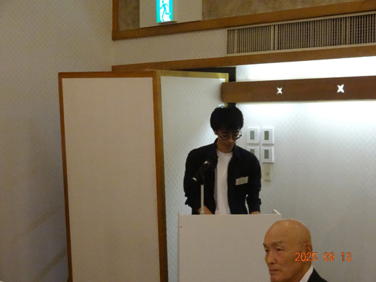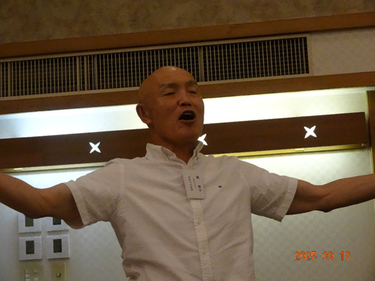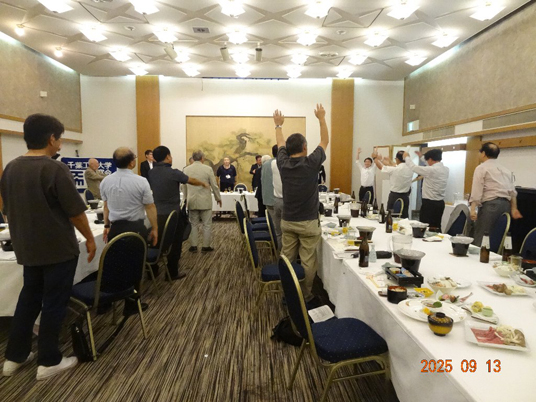 途中、今回初めて同窓会に参加して頂いた、藤江富一(土木S44)、大矢邦昭(電気S50)、田村俊彦(土木H9)から自己紹介がありました。 逍遙歌はバスバリトン歌手の藤江富一(土木S44)の独唱。その後、中澤賢氏(土木S52)の音頭で、校歌の1節を高々と歌い上げ、最後は、参加者の中で一番若い佐藤洋伸(院情報R7)の万歳三唱で会が終わりました。佐藤君は昨年から引き続きの万歳でした。1年間の進歩が見られた万歳でした。