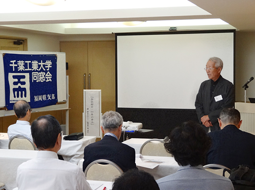 支部総会で船越支部長(昭和47年電子工学科卒)がスピーチしている様子